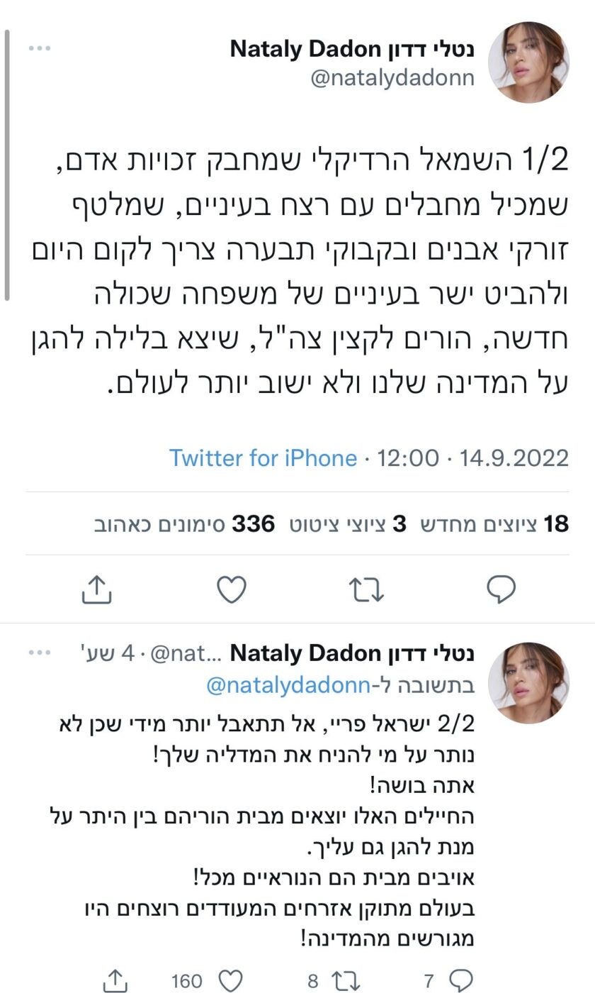 נטלי דדון שיתפה היום ציוץ זועם בחשבון הטוויטר שלה, בו היא מפנה את כעסה על נפילת הקצין שנהרג הלילה בעימותים, לשמאל הרדיקלי. וכך היא כותבת: