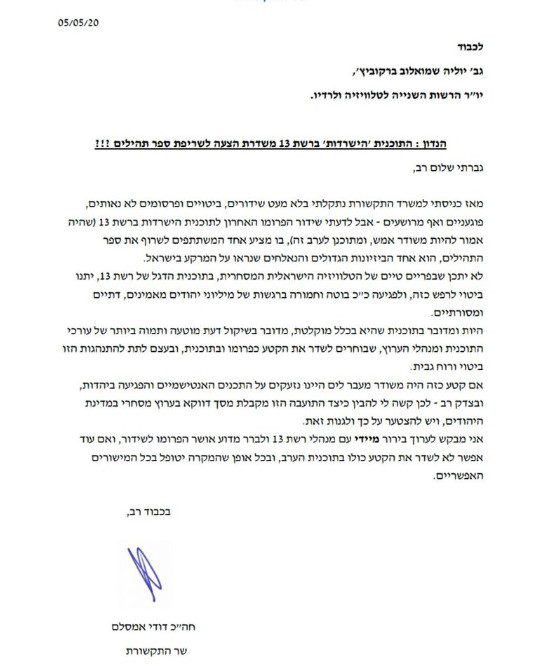 שר התקשורת אמסלם שיגר מכתב זועם, בו הוא דורש מ'רשת 13' שלא לשדר ואף לגנוז את הקטע השנוי במחלוקת: "פשוט ביזיון !!! איך מרשה לעצמה רשת 13 לשדר פרומו לתוכנית 'הישרדות' ובו הצעה לשריפת ספר תהילים ?!? דרשתי מיו"ר הרשות השניה טיפול מיידי ונוקב בנושא – כולל בקשה לגניזת הקטע שמתוכנן לשידור הערב."