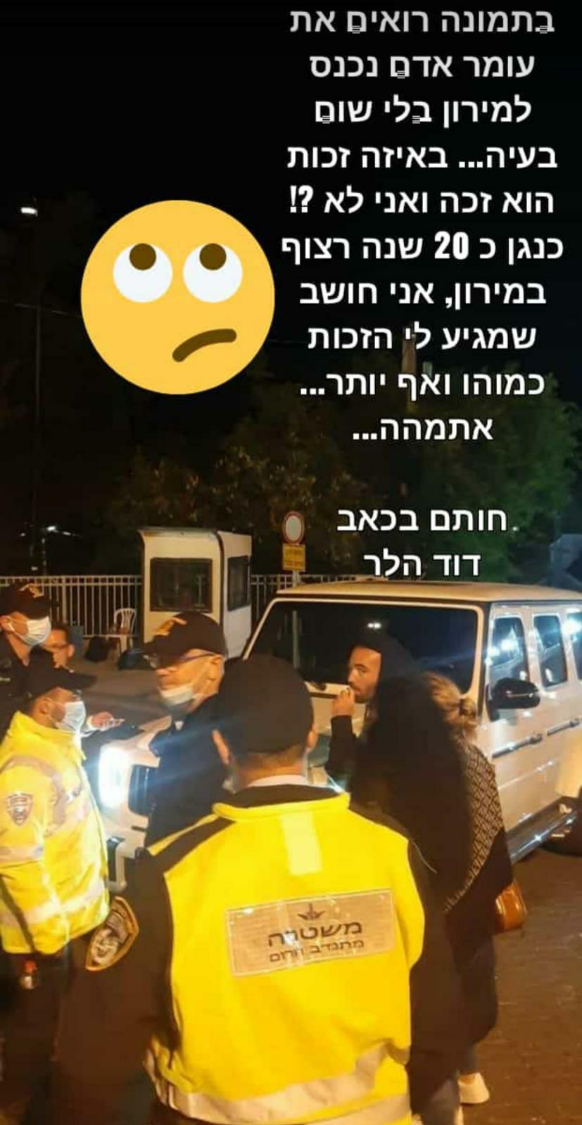 דוד הלר, נגן ירושלמי שמתנדב מעל 20 שנה בהילולות הרשב"י במירון כתב בכאב על האכיפה הבררנית: "אני חושב שמגיע לי הזכות ואף יותר"