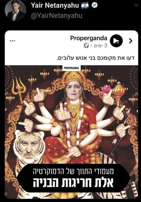 I’ve tweeted a meme from a satirical page, critizing political figures in Israel. I didn’t realize the meme also portrayed an image conected to the majestic Hindu faith. As soon as I realised it from comments of our Indian friends, I have removed the tweet. I apologize>>