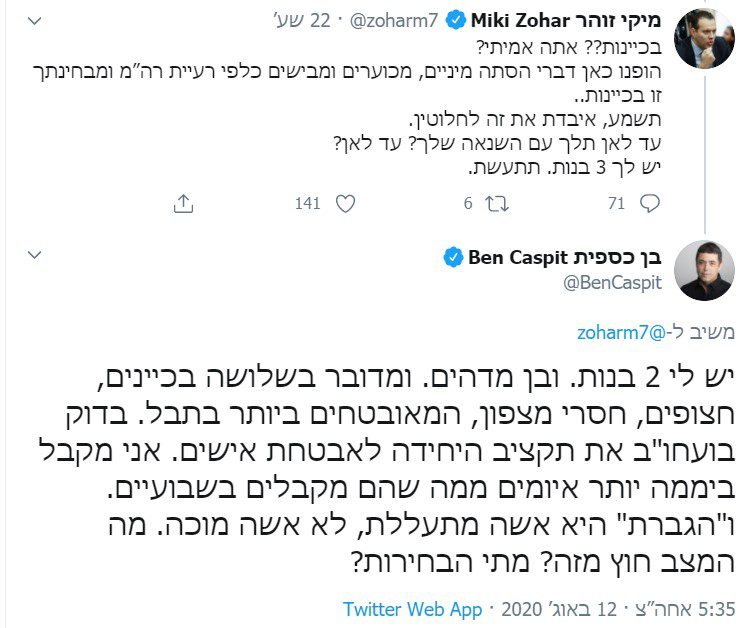 קרב ברשת: העיתונאי בן כספית פרסם כותרת מחמיאה על מכתב התגובה ששלח היועמ"ש מנדלבליט לראש הממשלה נתניהו, שהתלונן על אוזלת יד בטיפול בהסתה נגד משפחתו, "תשובה מדודה, מדוייקת וראויה של היועמ"ש למכתב הבכיינות של רה"מ" , כתב בן כספית וזכה לתגובה מיו"ר הקואליציה מיקי זוהר שהזכיר את בנותיו: "בכיינות?? אתה אמיתי? הופנו כאן דברי הסתה מיניים, מכוערים ומבישים כלפי רעיית רה״מ ומבחינתך זו בכיינות.. תשמע, איבדת את זה לחלוטין. עד לאן תלך עם השנאה שלך? עד לאן? יש לך 3 בנות. תתעשת.", כתב זוהר בתגובה.