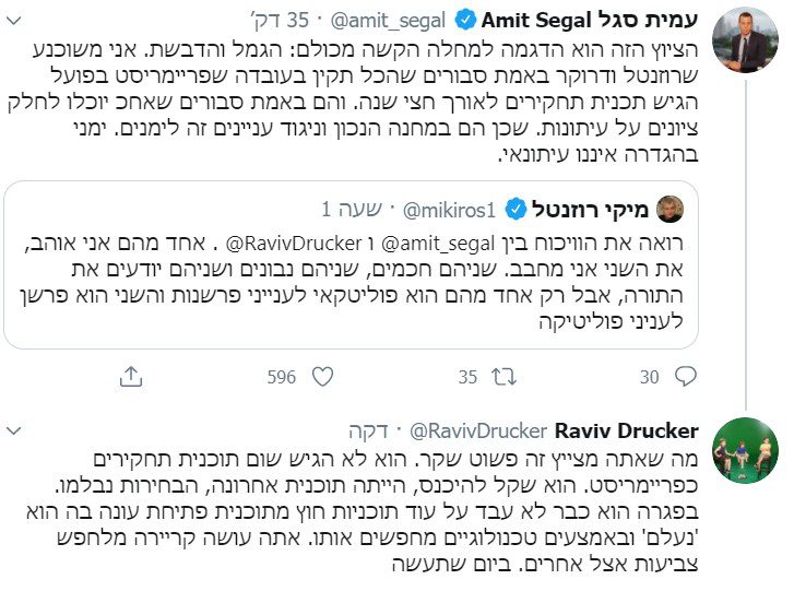 ח"כ לשעבר מיקי רוזנטל התערב בקרב הציוצים וירד על עמית סגל: "רואה את הוויכוח בין רביב דרוקר לעמית סגל, אחד מהם אני אוהב, את השני אני מחבב. שניהם חכמים, שניהם נבונים ושניהם יודעים את התורה, אבל רק אחד מהם הוא פוליטקאי לענייני פרשנות והשני הוא פרשן לעניני פוליטיקה", כתב רוזנטל בתגובה לסגל.