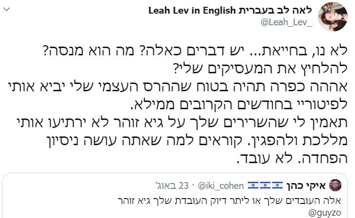 בתגובה לגולשים שתייגו את מגיש התוכנית גיא זוהר הגיבה לב: "לא נו, בחייאת… יש דברים כאלה? מה הוא מנסה? להלחיץ את המעסיקים שלי? אההה כפרה תהיה בטוח שההרס העצמי שלי יביא אותי לפיטוריי בחודשים הקרובים ממילא. תאמין לי שהשרירים שלך על גיא זוהר לא ירתיעו אותי מללכת ולהפגין. קוראים למה שאתה עושה ניסיון הפחדה. לא עובד."