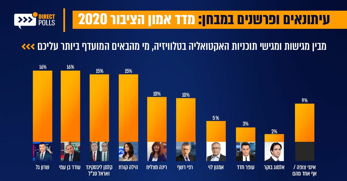לאחריו עודד בן עמי מ'ערוץ 12' עם 16%, ובמקום השלישי אראל סגל וקלמן ליבסקינד עם 15%. כזכור, לאחרונה החליט מנכ"ל התאגיד 'כאן 11' להוריד את תוכניתם של קלמן ליבסקינד ואראל סג"ל בטענה כי איננה מייצרת שיח ציבורי.