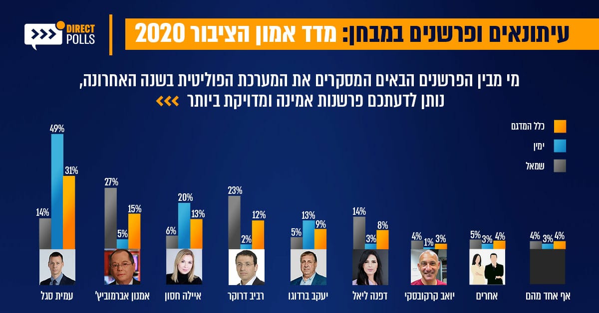 בשאלה על אמון הפרשנים בישראל, הגיבו הנשאלים כי עמית סגל הוא הפרשן עם האימון הגדול ביותר עם 31%, לאחריו אמנון אברמוביץ' עם 15%, איילה חסון 13%, רביב דרוקר 12%, יעקב ברדוגו 9%, דפנה ליאל 8%, יואב קרקובסקי 3% בלבד.