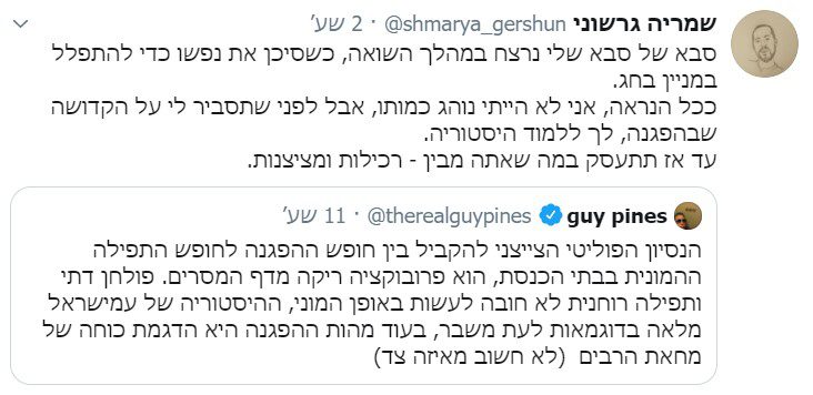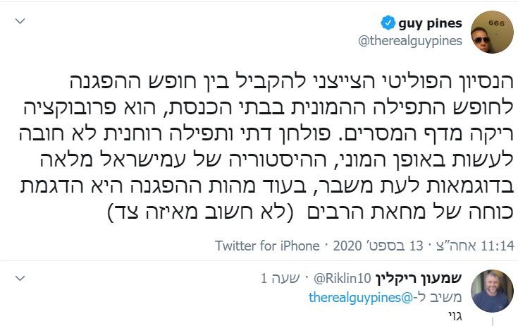 על רקע הזעם הציבורי על אישור היועמ"ש להמשיך בהפגנות בלפור נגד ראש הממשלה נתניהו, למרות הסגר והמגבלות החמורות שהוטלו על יד משרד הבריאות, איש הטלוויזיה גיא פינס מסעיר את הרשת לאחר שהבדיל בין תפילה להפגנה: "הנסיון הפוליטי הצייצני להקביל בין חופש ההפגנה לחופש התפילה ההמונית בבתי הכנסת, הוא פרובוקציה ריקה מדף המסרים. פולחן דתי ותפילה רוחנית לא חובה לעשות באופן המוני, ההיסטוריה של עמישראל מלאה בדוגמאות לעת משבר, בעוד מהות ההפגנה היא הדגמת כוחה של מחאת הרבים (לא חשוב מאיזה צד)"', צייץ פינס וספג מאות תגובות זועמות ביניהם העיתונאי שמעון ריקלין שהגיב: "גוי".