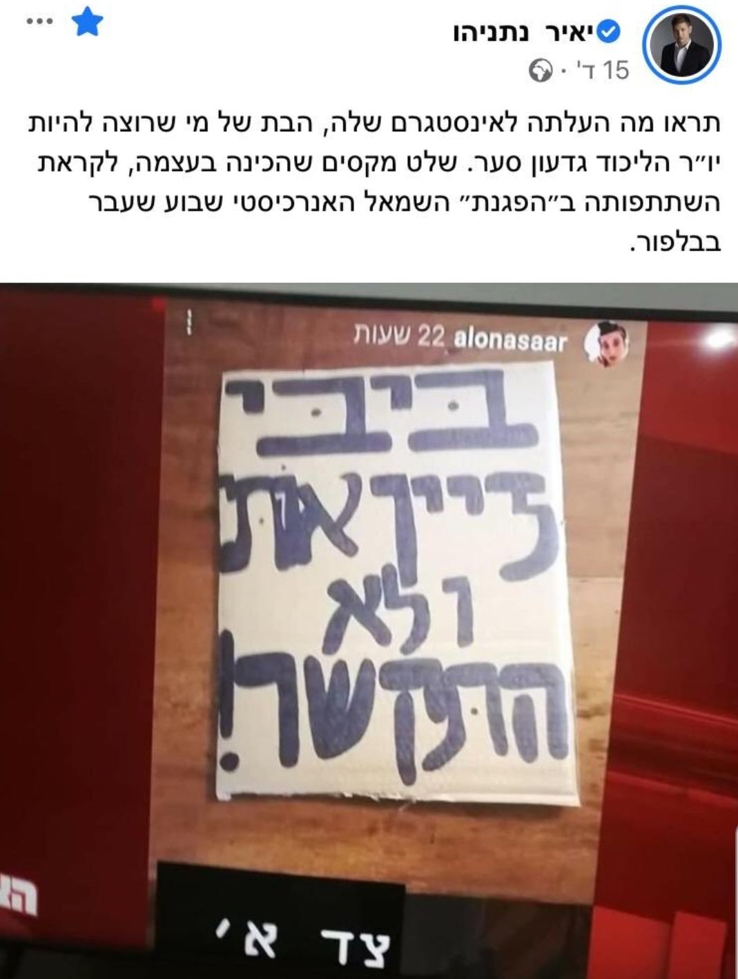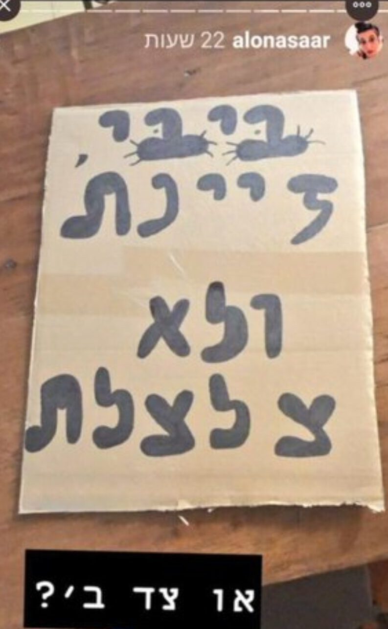 אלונה סער, בתו של ח"כ גדעון סער מהליכוד שהשתתפה במוצאי שבת האחרונה בהפגנות מול מעון ראש הממשלה בבלפור, שיתפה וביקשה מהעוקבים באינסטגרם את חוות דעתם על שלטי המחאה השנויים במחלוקת שהכינה להפגנה: "ביבי ז*** אותי ולא התקשר", בשלט נוסף שפרסמה נכתב: "ביבי זיינת ולא צלצלת". .
