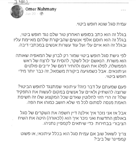 גם ח"כ יאיר גולן שזוכה לחסינות מבתיעות נקלע בשבוע שעבר לעימות ברשתות החברתיות עם עמית סגל לאחר שחשף את הקלטות מנדלבליט על שי ניצן: "אז עמית סגל עלה להתקפה, והגיש נגדי תביעת דיבה. עיתונאי החצר של בלפור, האיש הממונה על הספינים התקשורתיים עבור נתניהו, סבור שאין זה ראוי שאפילו ארמוז על שותפותו בארגון העברייני שמקיף את ראש הממשלה, לדעתי כמובן."