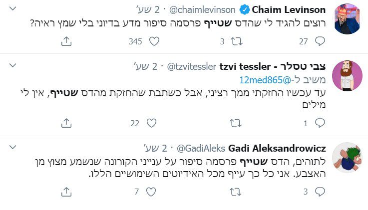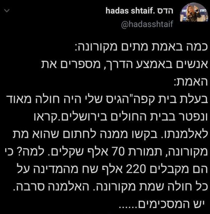 צייצה ומחקה: העיתונאית הדס שטייף מגלי צה"ל מעוררת סערה ברשתות החברתיות לאחר שפרסמה בטוויטר עדות ששמעה בבית קפה, כי בתי החולים משדלים לכאורה חולים לחתום שיקיריהם מתו מקורונה בעבור קבלת כסף מהמדינה: "כמה באמת מתים מקורונה?" כתבה שטייף בדרמטיות והוסיפה: "אנשים באמצע הדרך, מספרים את האמת. הגיס שלי היה חולה מאוד ונפטר בבית החולים בירושלים. קראו לאלמנתו. ביקשו ממנה לחתום שהוא מת מקורונה, תמורת 70 אלף שקלים. למה? כי הם מקבלים 220 אלף ש"ח מהמדינה על כל חולה שמת מקורונה. האלמנה סרבה"