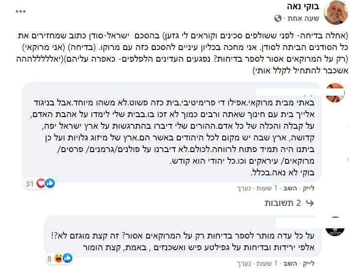 קרן הגיבה: "באתי מבית מרוקאי.אפילו די פרימיטיבי.בית כזה פשוט.לא משהו מיוחד.אבל בניגוד אלייך בית עם חינוך שאתה ורבים כמוך לא זכו בו. בבית שלי לימדו על אהבת האדם, על קבלה והכלה של כל אדם.ההורים שלי דיברו בהתרגשות על ארץ ישראל יפה, קדושה, ארץ שבה יש מקום לכל היהודים באשר הם.ארץ של מיזוג גלויות ועל כן ביתנו היה תמיד פתוח לרווחה. לכולם. לא דיברנו על פולנים/גרמנים/ פרסים/ מרוקאים/ עיראקים וכו.כל יהודי הוא קודש. בוקי לא נאה.בכלל."