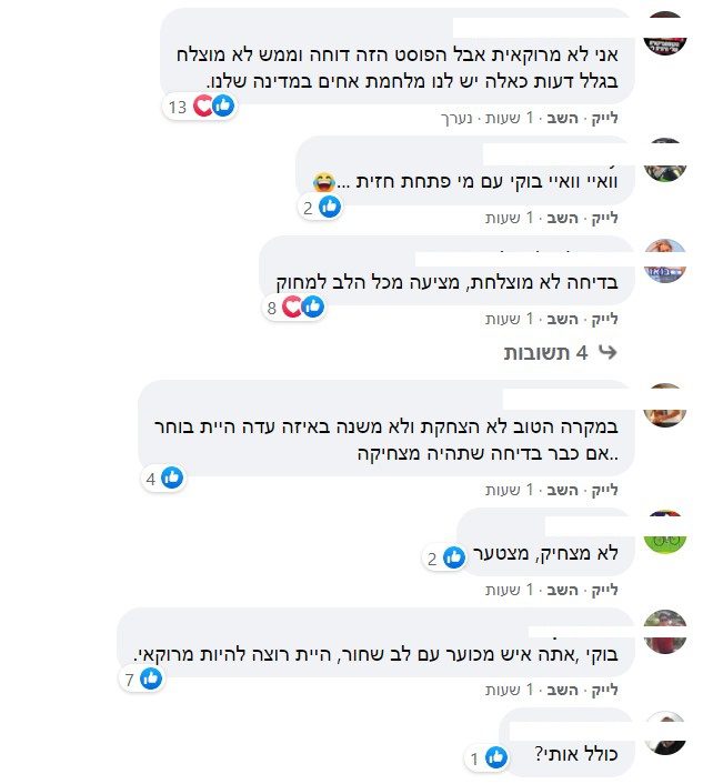 מנגד הגולשת ענת הגיבה בהבנה: "על כל עדה מותר לספר בדיחות רק על המרוקאים אסור? זה קצת מוגזם לא?! אלפי ירידות ובדיחות על גפילטע פיש ואשכנזים , באמת, קצת הומור"