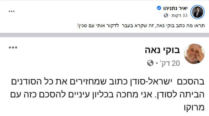כתב הפלילים לשעבר בוקי נאה מסעיר את הרשתות החברתיות בעקבות בדיחה שסיפר על רקע הסכמי השלום עם סודן: "בהסכם ישראל-סודן כתוב שמחזירים את כל הסודנים הביתה לסודן. אני מחכה בכליון עיניים להסכם כזה עם מרוקו", כתב נאה בהומור.