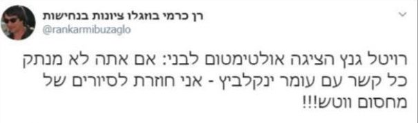 רעיית יו"ר כחול לבן בני גנץ שיגרה מכתב אזהרה ודרישה להתנצלות, מפעיל הימין רן כרמי בוזגלו, בעקבות ציוץ הרומז על קשריו של בני גנץ עם ח"כ החרדית עומר ינקלביץ' מכחול לבן, שפרסם בעמוד הטוויטר שלו על רויטל גנץ: "רויטל גנץ הציבה אולטימטום לבני: אם אתה לא מנתק כל קשר עם עומר ינקלביץ', אני חוזרת לסיורים של מחסום ווטש", נכתב בציוץ.