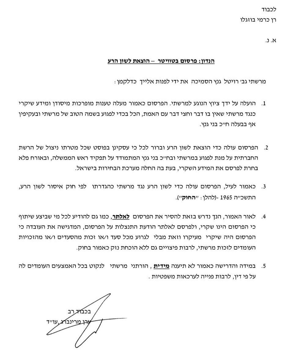 בתביעה שנשלחה לכרמי בוזגלו דורשת גנץ, להסיר את הציוץ ולפרסם התנצלות.