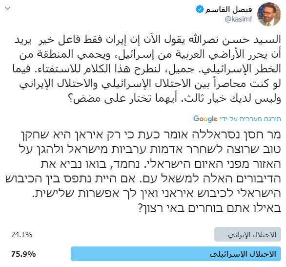 העיתונאי פייסל קאסם מאל ג'זירה עם יותר מ-5 מיליון עוקבים בטוויטר, פרסם סקר בוא הוא שואל תחת איזה כיבוש אתם מעדיפים לחיות, התוצאות ברורות וחד משמעיות: "נסראללה טען היום שאיראן עושה רק טוב לאומה הערבית, ומנסה לשחרר אדמות ערביות מידי ישראל. בסדר, אשאל אתכם: אם הייתם חייבים לחיות תחת אחד כיבוש של אחת מהשתיים – איראן או ישראל, את מי הייתם מעדיפים?"