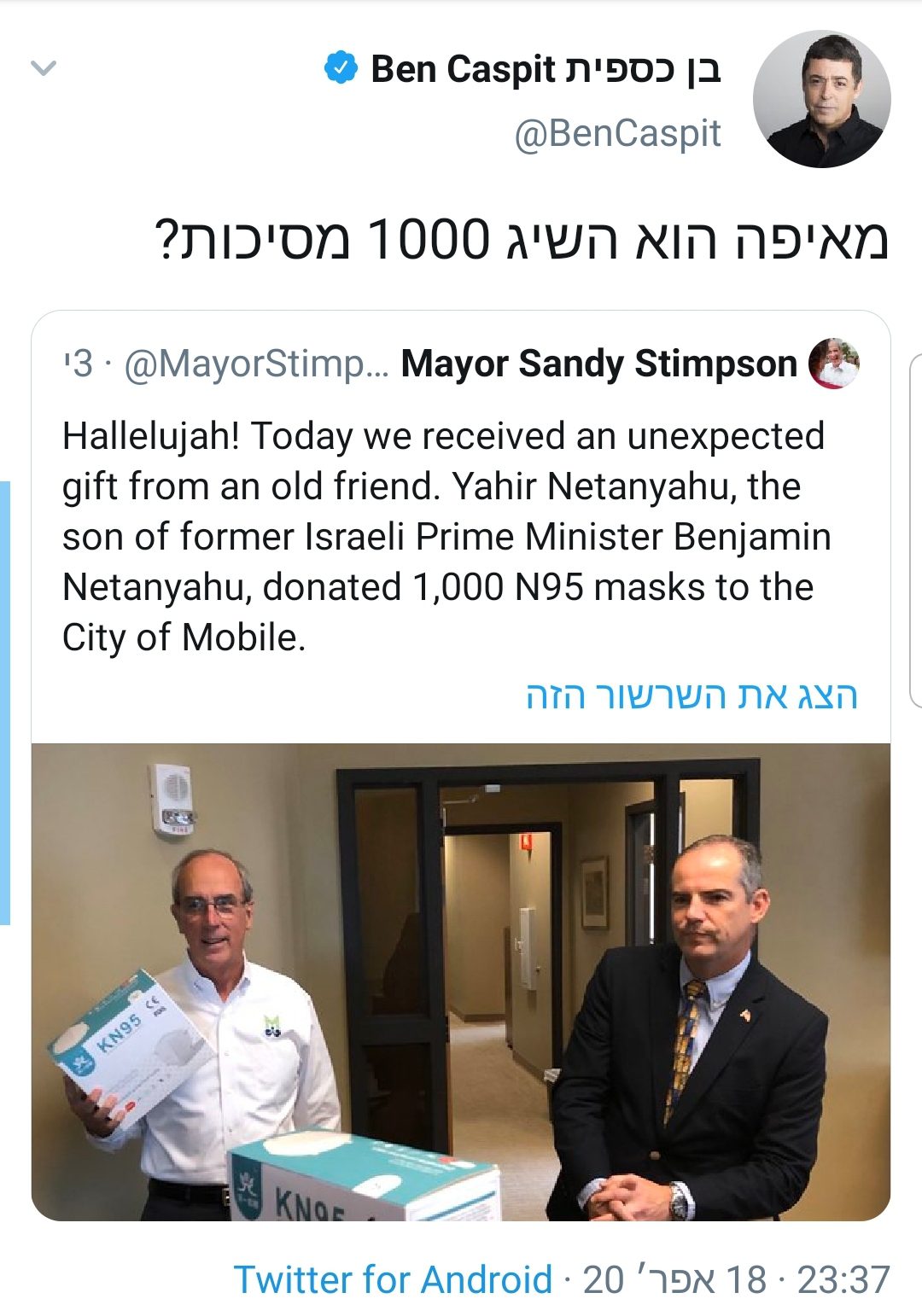 ראש עיריית מוביל, סנדי סטימפסון (Sandy Stimpson) צייץ את תרומת המסכות מסוג N95 והודה ליאיר נתניהו, בנו של רה"מ על התרומה החשובה לעיר ושהועברו למוסדות הרפואיים המטפלים בנגיף הקורונה.