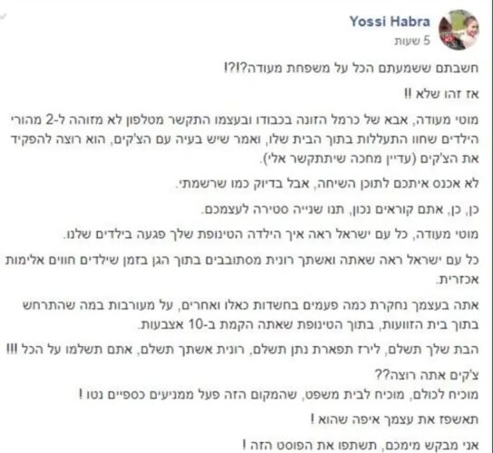 אורי רצון, שבתו היתה בפעוטון "בייבי לאב" של מעודה בראש העין, קיבל שיחה כזו הבוקר. "האבא התקשר אלי ואמר שהצ'ק האחרון שלנו לא כובד. כנראה שהצ'ק לא היה חתום טוב. הוא דרש לקבל צ'ק חלופי כנגדו". כך דווח באתר 'ישראל היום'
