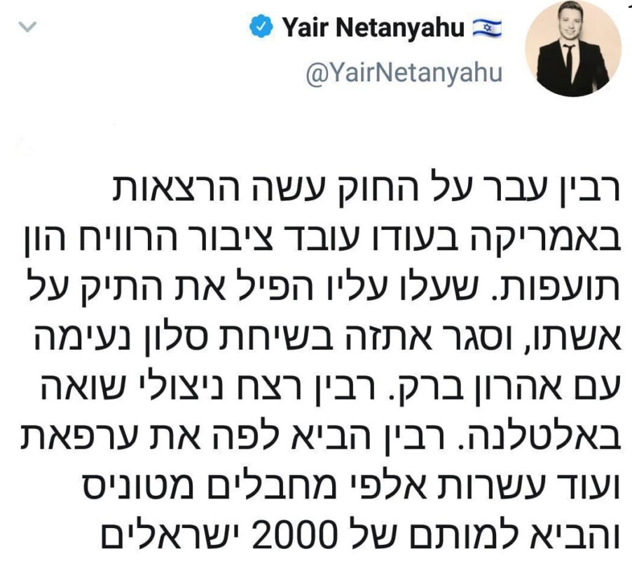 תגובות סוערות נגד יאיר נתניהו, שכתב אמש בעמוד הטוויטר שלו ומחק לאחר מכן, "רבין עבר על החוק, עשה הרצאות באמריקה בעודו עובד ציבור והרוויח הון תועפות. כשעלו עליו הפיל את התיק על אשתו, וסגר את זה בשיחת סלון נעימה עם אהרון ברק. רבין רצח ניצולי שואה באלטלנה. רבין הביא לפה את ערפאת ועוד עשרות אלפי מחבלים מטוניס והביא למותם של 2,000 ישראלים". כתב יאיר נתניהו ומחק לאחר הסערה.