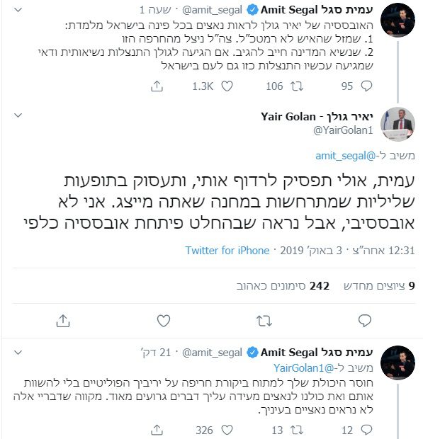 יאיר גולן הגיב למתקפה של עמית סגל בטוויטר: "עמית, אולי תפסיק לרדוף אותי, ותעסוק בתופעות שליליות שמתרחשות במחנה שאתה מייצג. אני לא אובססיבי, אבל נראה שבהחלט פיתחת אובססיה כלפי"