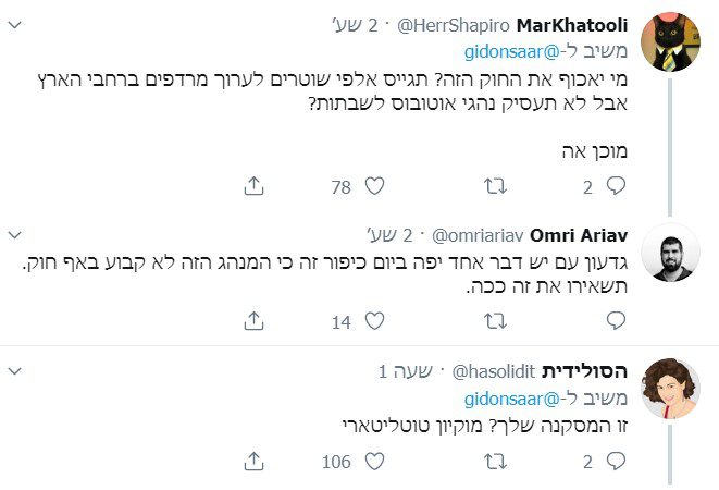 ח"כ גדעון סער צייץ ברשת הטוויטר לאחר החג: "בדרכי לתפילת ״נעילה״ עברתי ליד מקום התאונה המחרידה בצומת נמיר בה צעיר בן 20 דרס למוות ילד בן 8 שרכב על אופניים. מזעזע.יותר ויותר נהגים מנצלים את העובדה שאין חוק האוסר נסיעה ביום הכיפורים, נוהגים בעיר ומסכנים חיי ילדים. בכוונתי ליזום חקיקה האוסרת נסיעה בערים ביו״כ למעט במקרי חרום"