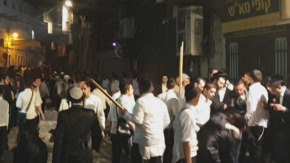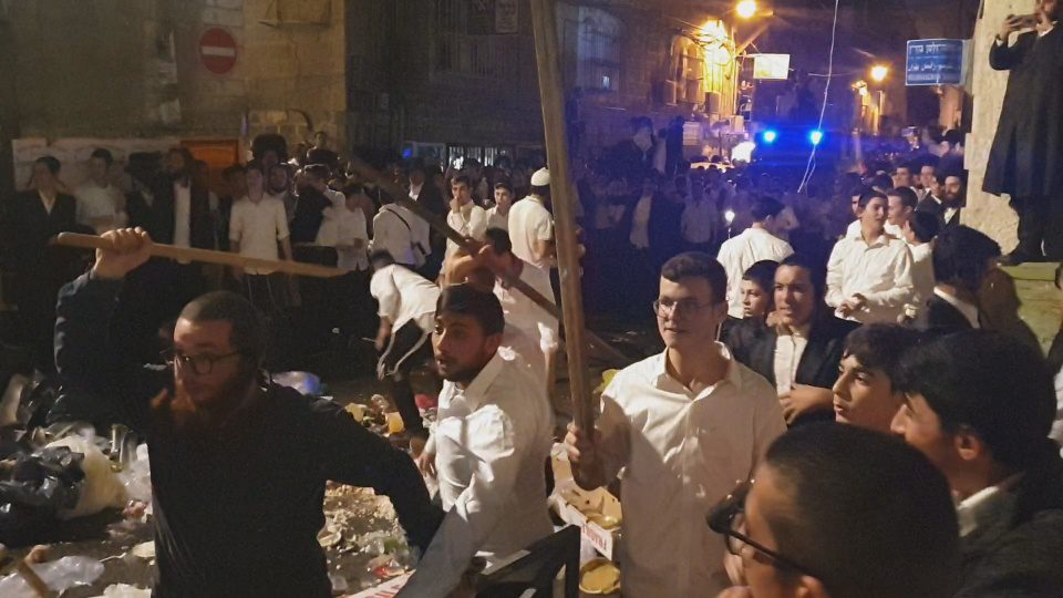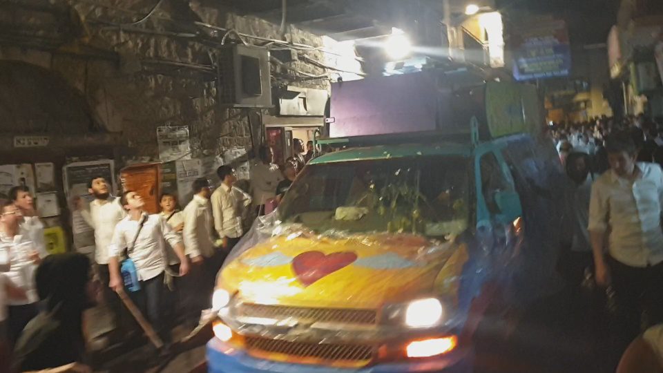 לא צנוע: במהלך הקפות שניות אמש במאה שערים בירושלים, נכנסו אנשי 'נ נח' לשכונה הקיצונית יחד עם מאות צעירים שמחים ורוקדים לצלילי המוזיקה הרועשת והמקפיצה של הרכב הנוסע ברחובות מאה שערים.