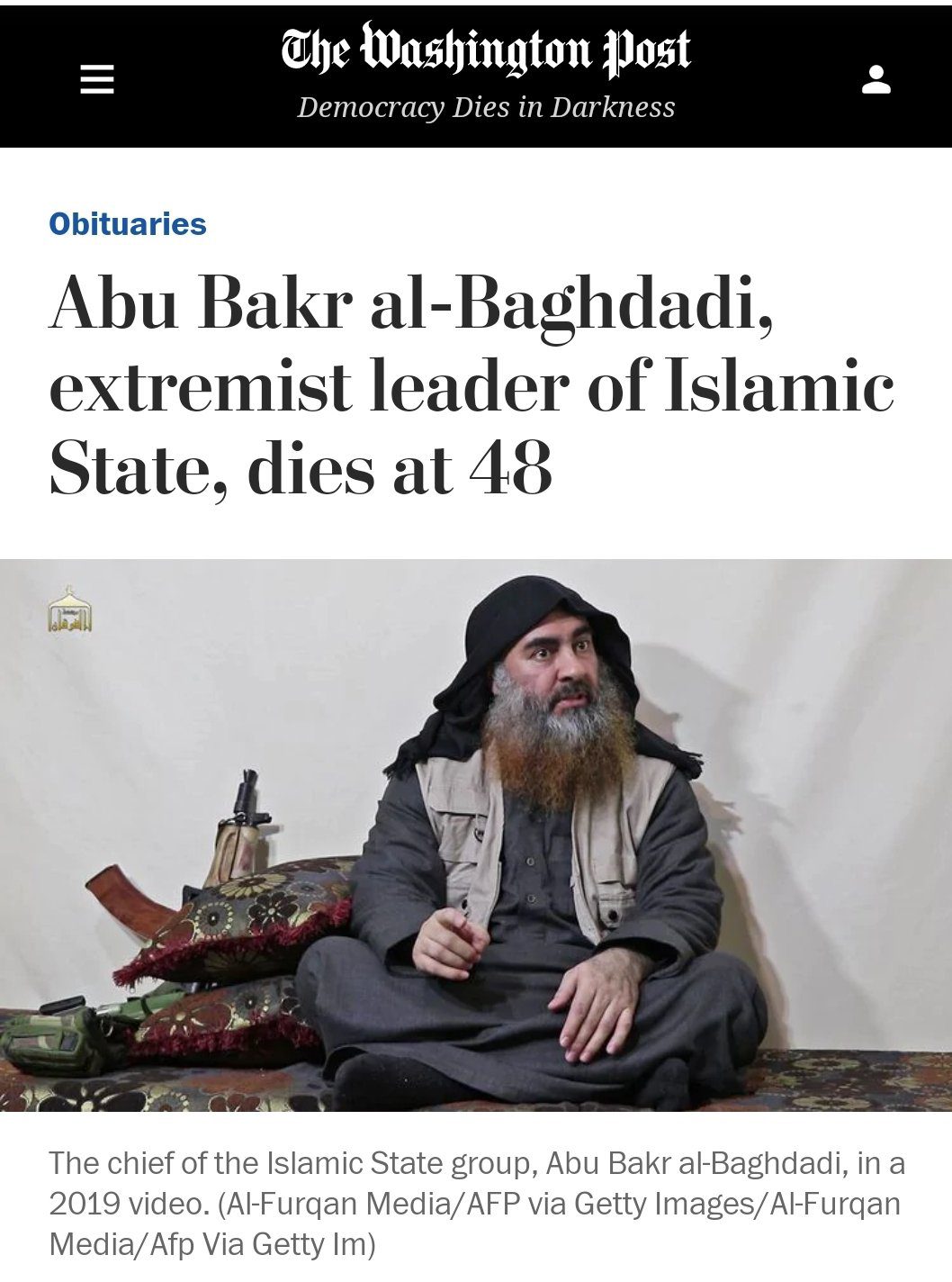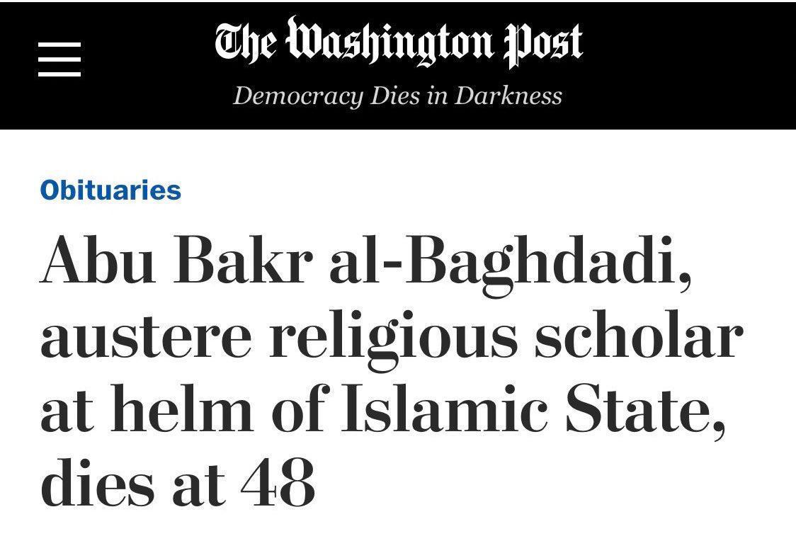איבדו את הראש: עיתון 'הוושינגטון פוסט' פרסם ידיעה על חיסול מנהיג ארגון הטרור דאעש שאחראי על רצח אלפי בני אדם חפים מפשע, כשבכותרת נכתב: "אבו בכר אל בגדדי, הוגה דתי מחמיר שעמד בראש דאעש, מת בגיל 48". לאחר מכן שונתה הכותרת: "אבו בכר אל-בגדדי, מנהיג קיצוני של דאעש, מת בגיל 48" - יש לכם הצעה לכותרת טובה יותר? שתפו