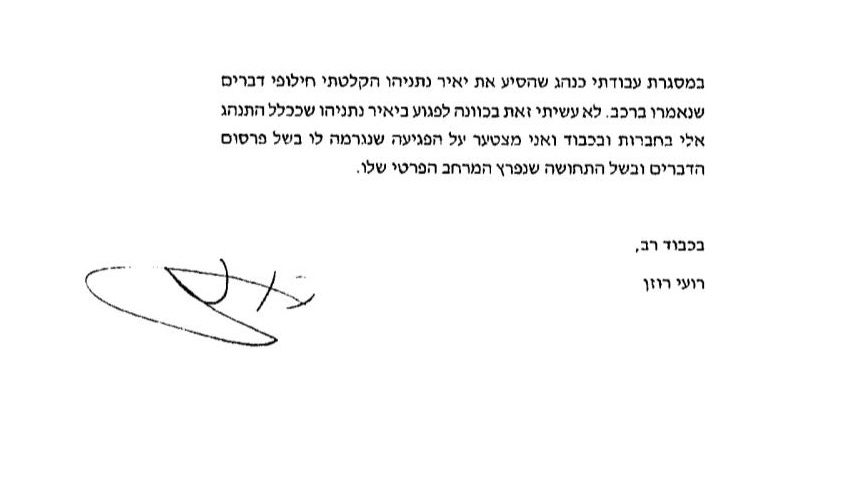 בהתנצלותו כתב הנהג רוזן: "במסגרת עבודתי כנהג שהסיע את יאיר נתניהו הקלטתי חילופי דברים שנאמרו ברכב. לא עשיתי זאת בכוונה לפגוע ביאיר נתניהו שככלל התנהג אלי בחברות ובכבוד ואני מצטער על הפגיעה שנגרמה לו בשל פרסום הדברים ובשל התחושה שנפרץ המרחב הפרטי שלו", כך נכתב בהתנצלות