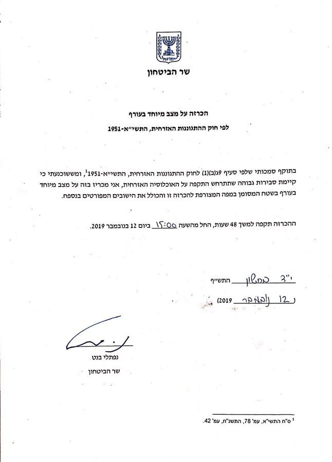 שר הביטחון, נפתלי בנט, הכריז כעת על מצב מיוחד בעורף: שר הביטחון, נפתלי בנט, הכריז על מצב מיוחד בעורף ביישובים הנמצאים בטווח שבין 0-80 ק"מ מרצועת עזה.