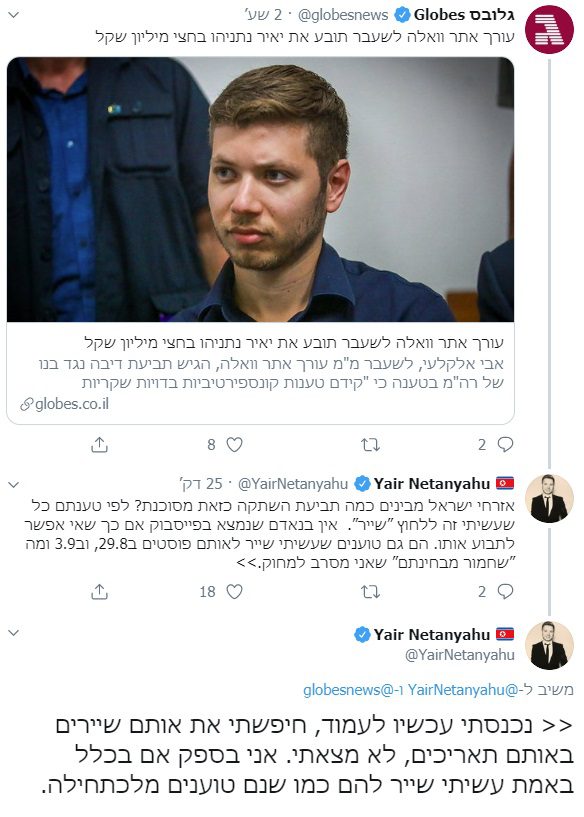 עורך אתר וואלה לשעבר אבי אלקלעי הגיש תביעת דיבה בסך חצי מיליון שקל נגד יאיר נתניהו שעשה שיתוף לפוסט מכפיש נגדו בפייסבוק בו נכתב כי הוא שתול של קרן וקסנר בשביל להפיל את נתניהו - יאיר בתגובה: "מה השלב הבא לקבל תביעות על לייקים?"