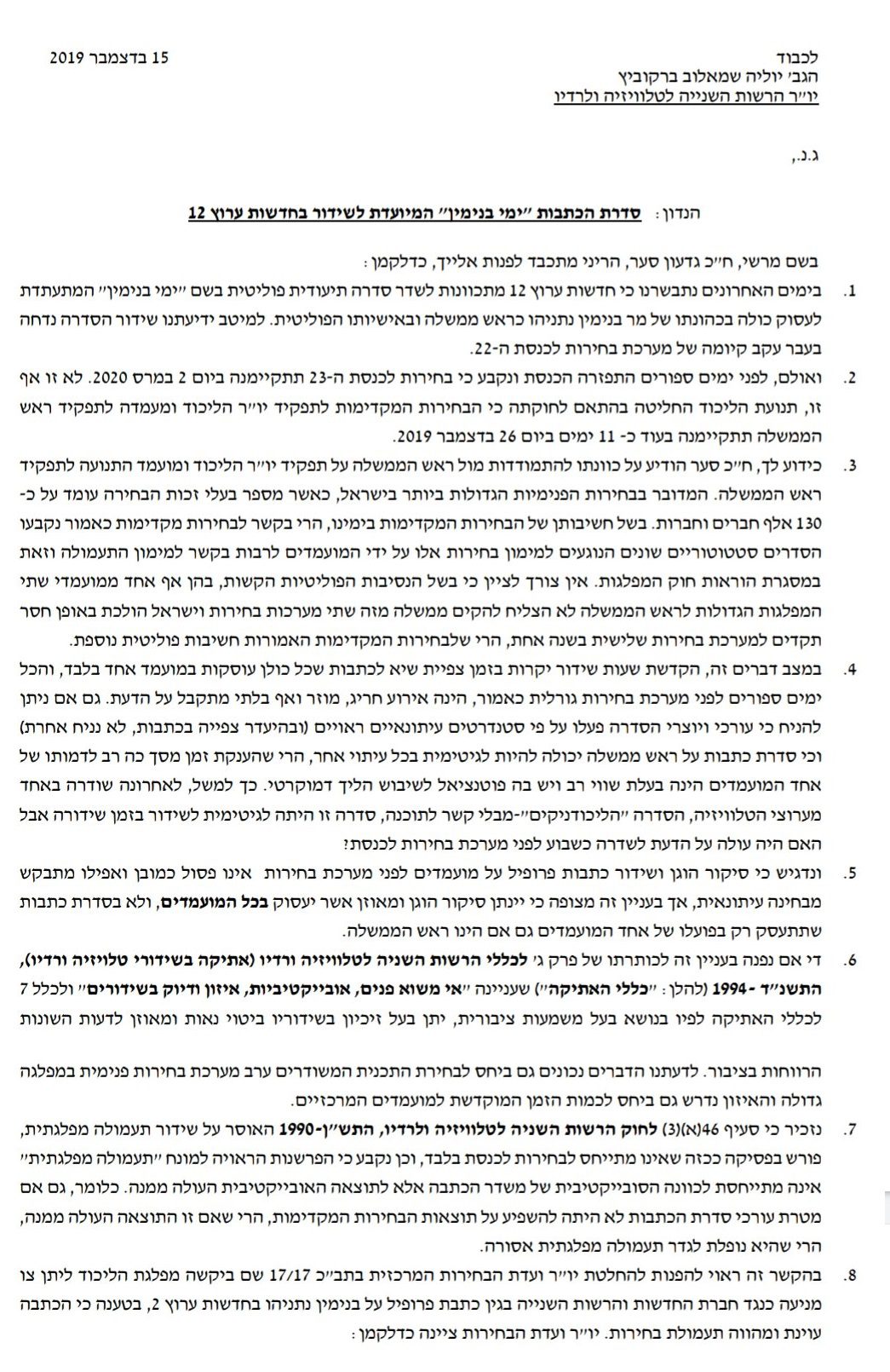 ח"כ גדעון סער המתמודד בפריימריז נגד ראש הממשלה נתניהו על ראשות הליכוד שיגר מכתב ליו"ר הרשות השנייה בדירשה לדחות בשבועיים את פרסום הסדרה 'ימי בנימין' של עמית סגל בחדשות 12