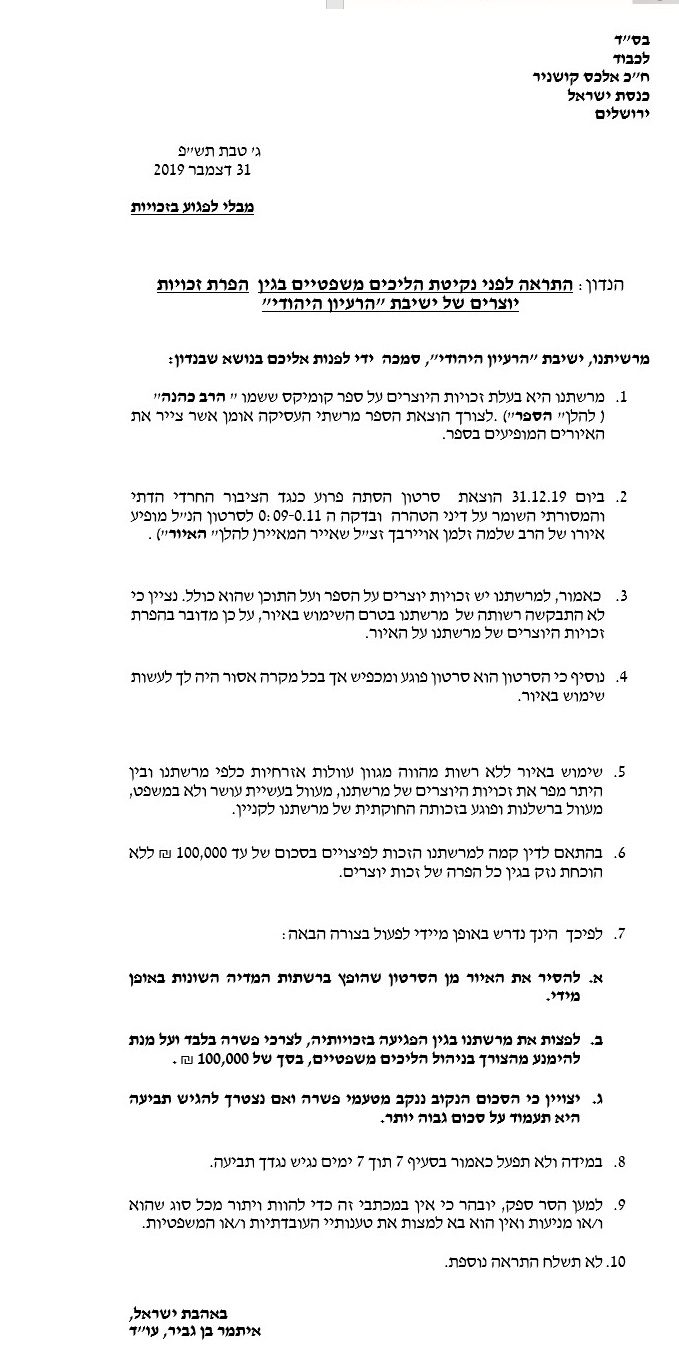 קושניר נדרש במכתב להסיר את האיור מן הסרטון שהופץ ברשתות המדיה השונות באופן מיידי, וכו לפצות את ישיבת הרעיון היהודי בגין הפגיעה בזכויותיה בסכום של 100,000 ₪.