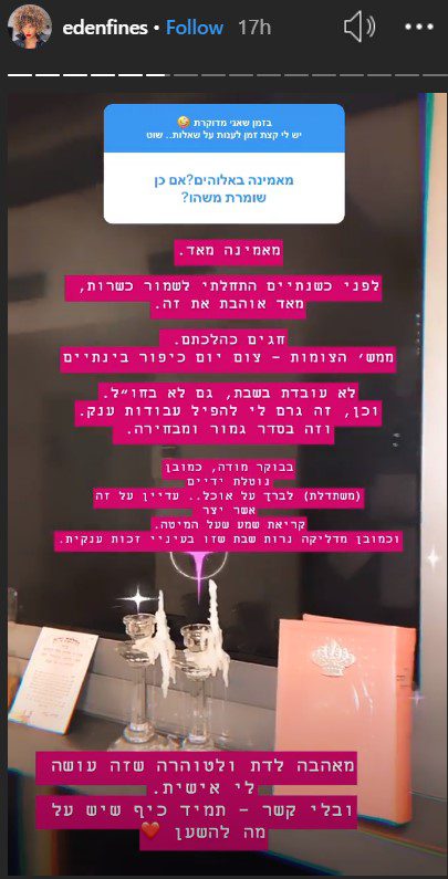 עוד כותבת פינס: "בבוקר מודה וכמובן נטילת ידיים. (משתדלת) לברך על אוכל… עדיין על זה. אשר יצר. קריאת שמע על המיטה. וכמובן מדליקה נרות שבת שזו בעיניי זכות ענקית. מאהבה לדת ולטוהרה שזה עושה לי אישית. ובלי קשר, תמיד כייף שיש על מי להישען", סיימה פיס את הווידוי האישי בסטורי.