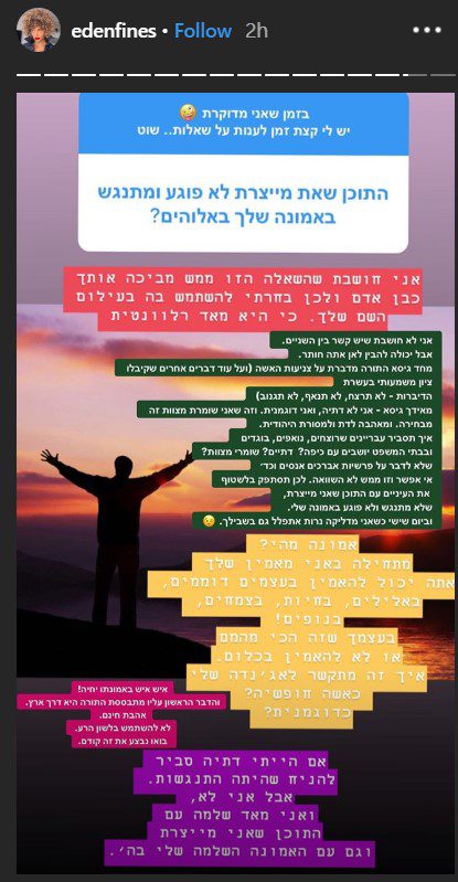 לאחר מכן נשאלה עדן, האם התוכן שהיא מייצרת לא מתנגש באמונתה בדת והגיבה: "השאלה שלך מאוד מביכה. איש איש באמונתו יחיה"