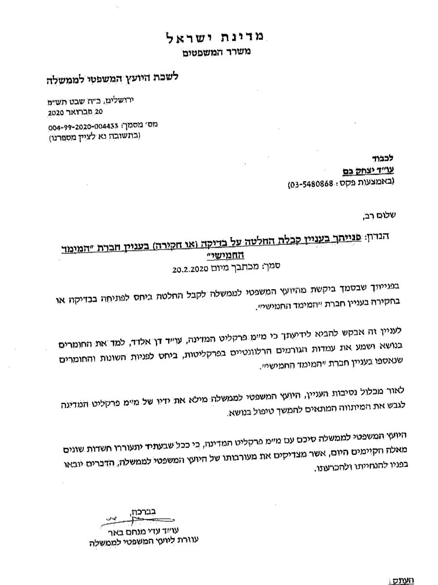 "היועץ המשפטי לממשלה, אביחי מנדלבליט, ופרקליט המדינה לשעבר, שי ניצן, כבר קבעו בעבר את העיקרון לפיו יש לנקוט באופן מידי, עוד לפני הבחירות, בהליכים הנוגעים למועמדים לראשות הממשלה ולאישי ציבור, בין היתר, משום שלגישתם יש לתת מידע שלם ומלא לבוחר עוד לפני הכרעתו. לאורה של מדיניות זאת, שבאה לידי ביטוי במלוא עוצמתה בשורה של החלטות ופעולות שנעשו ערב בחירות בעניינו של ראש הממשלה, מר בנימין נתניהו, לא ייתכן כי בנוגע לבני גנץ ולמימד החמישי תינקט מדיניות אחרת."