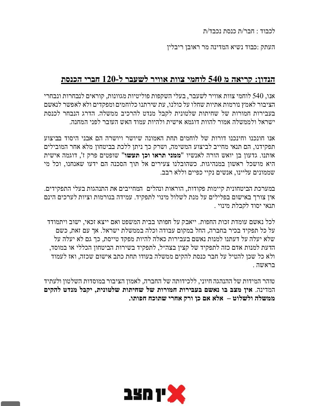 פנייה חדשה לנשיא המדינה ולחברי הכנסת: 540 טייסים ונווטים לשעבר פנו במכתב לחברי הכנסת ולנשיא המדינה ריבלין, שלא יאפשרו לראש הממשלה נתניהו לקבל את המנדט להרכבת הממשלה, בגלל החשדות נגדו לשחיתות חמורה. "לכל נאשם עומדת חזקת החפות. ייאבק על חפותו בבית המשפט, ואם ייצא זכאי, ישוב ויתמודד לכל תפקיד בחברה החל במקום עבודה וכלה בממשלת ישראל"