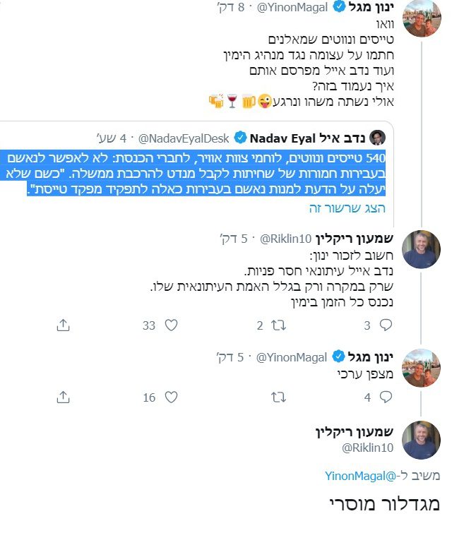 ינון מגל הגיב בציוניות לעיתונאי נדב אייל שפרסם את הידיעה: "וואו. טייסים ונווטים שמאלנים. חתמו על עצומה נגד מנהיג הימין. ועוד נדב אייל מפרסם אותם. איך נעמוד בזה? אולי נשתה משהו ונרגע"