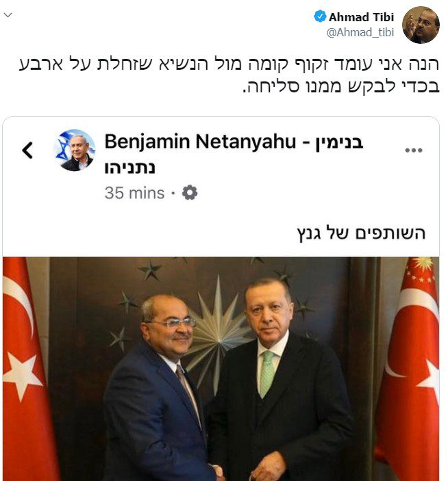 בתגובה לקמפיין של 'כחול לבן' המשווה את נתניהו לארדואן, פרסם ראש הממשלה נתניהו תמונה של טיבי וארדואן עם הכותרת "החברים של גנץ". "ח"כ טיבי לא נשאר חייב וכתב: "הנה אני עומד זקוף קומה מול הנשיא שזחלת על ארבע בכדי לבקש ממנו סליחה."