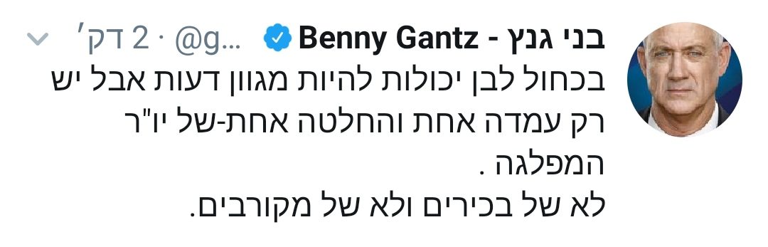 יו"ר כחול לבן בני גנץ מגיב לסערת הנדל והשמועות על סילוקם מהמפלגה: "בכחול לבן יכולות להיות מגוון דעות אבל יש רק עמדה אחת והחלטה אחת-של יו"ר המפלגה . לא של בכירים ולא של מקורבים"