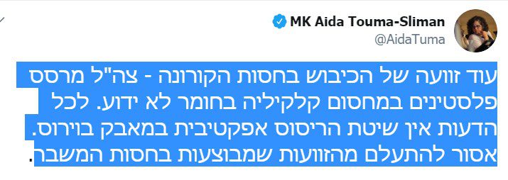 ח"כ עאידה תומא סלימאן, בכירה בהרשימה המשותפת, מאשימה הבוקר את כוחות צה"ל בעלילת דם, ומפרסמת תיעוד בו נראים הפועלים הפלסטינים במעבר קלקליה עוברים חיטוי מחשש לקורונה. בפוסט שפרסמה סולימאן היא מאשימה: "עוד זוועה של הכיבוש בחסות הקורונה – צה"ל מרסס פלסטינים במחסום קלקיליה בחומר לא ידוע. לכל הדעות אין שיטת הריסוס אפקטיבית במאבק בוירוס. אסור להתעלם מהזוועות שמבוצעות בחסות המשבר", כתבה סולימאן.