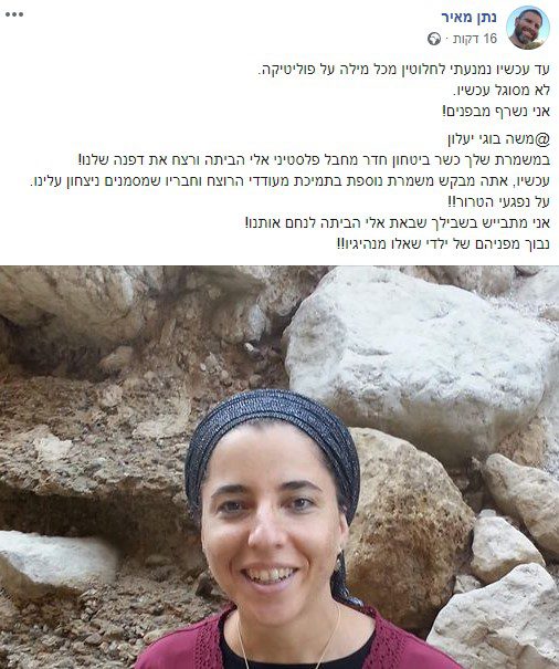 בפוסט שפרסם נתן מאיר בפייסבוק הוא כותב: "עד עכשיו נמנעתי לחלוטין מכל מילה על פוליטיקה. לא מסוגל עכשיו. אני נשרף מבפנים!. משה בוגי יעלון, במשמרת שלך כשר ביטחון חדר מחבל פלסטיני אלי הביתה ורצח את דפנה שלנו! עכשיו, אתה מבקש משמרת נוספת בתמיכת מעודדי הרוצח וחבריו שמסמנים ניצחון עלינו. על נפגעי הטרור!! אני מתבייש בשבילך שבאת אלי הביתה לנחם אותנו! נבוך מפניהם של ילדי שאלו מנהיגיו!!", כתב נתן מאיר בכאב.