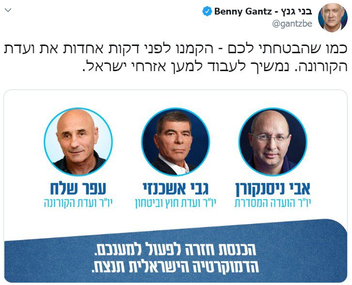 יו"ר 'כחול לבן' ח"כ גנץ צייץ והתעלם מהוועדות שקיבלו חברי הרשימה המשותפת: "כמו שהבטחתי לכם – הקמנו לפני דקות אחדות את ועדת הקורונה. נמשיך לעבוד למען אזרחי ישראל."