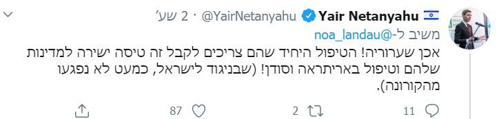 יאיר נתניהו, בנו של ראש הממשלה, הגיב בזעם למסמך שפרסמה כתבת 'הארץ' נעה לאנדא, כי במל"ל גיבשו תוכנית פעולה, לטפל במבקשי המקלט שחלו בקורונה כמו באזרחים: "אכן שערוריה! הטיפול היחיד שהם צריכים לקבל זה טיסה ישירה למדינות שלהם וטיפול באריתראה וסודן! (שבניגוד לישראל, כמעט לא נפגעו מהקורונה).", צייץ יאיר בתגובה.