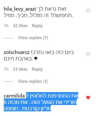 גולשת נוספת כתבה: "אין קיסריה? תרגעי, ימים טובים יחזרו. אל תעשי פרודיה, כואב". גולש נוסף הגיב: "את התחרפנת לחלוטין ? תורידי את הגועל הזה . את מבזה 6 מליון קורבנות . חצופה"