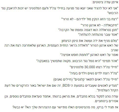 לסיום כתב הצל: "תשמע, לא רק שאתה לקקן, אתה מנותק, אתה הזוי, אתה מוסת ואתה חלק ממהנדסי המוחות. לא מאמין שחיבבתי אותך פעם (לפני שעשיתי לכם בית ספר באולפן וגנזתם את הקטע) ושיהיה לך ברור אף 0מאלני לא חושב שאתה ישר אובסדר או עיתונאי בגלל הליקוקים שלך, חושבים שאתה לא יותר מאדיוט שימושי. אז בקשר למה שאמרת, אני אתן לך קצת ציטוטים שאהובך החדש הדמוקרט הגדול האנטי טרור אמר, תגיד לי לאיזה מהדברים אתה מתחבר. דרך אגב במצע של הרשימה המשותפת מסרבים להכיר במדינת ישראל."