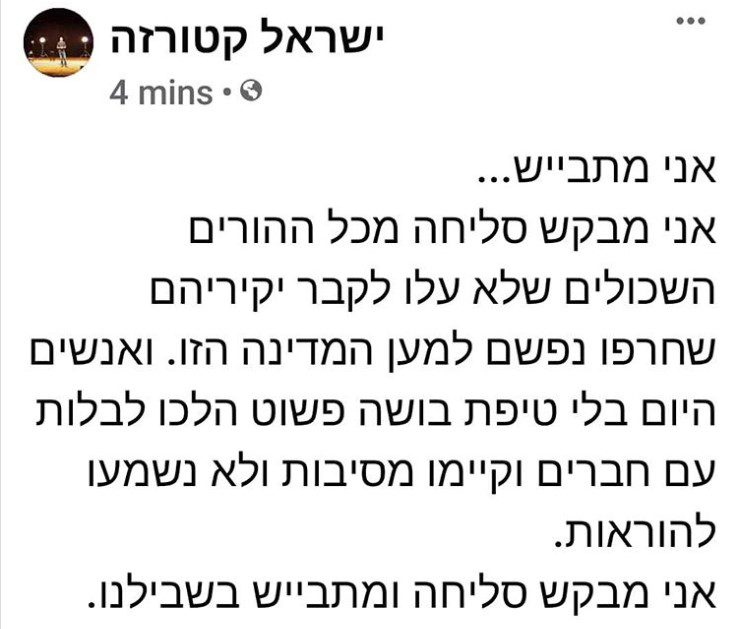 ההפקרות בברנז'ה: בתגובה לפרסום המנקר עיניים מחגיגות העצמאות של אייל גולן וחברים, הקומיקאי ישראל קטורזה מפרסם הודעת התנצלות וגינוי: "אני מתבייש… אני מבקש סליחה מכל ההורים השכולים שלא עלו לקבר יקיריהם שחרפו נפשם למען המדינה הזו. ואנשים היום בלי טיפת בושה פשוט הלכו לבלות עם חברים וקיימו מסיבות ולא נשמעו להוראות. אני מבקש סליחה ומתבייש בשבילנו".