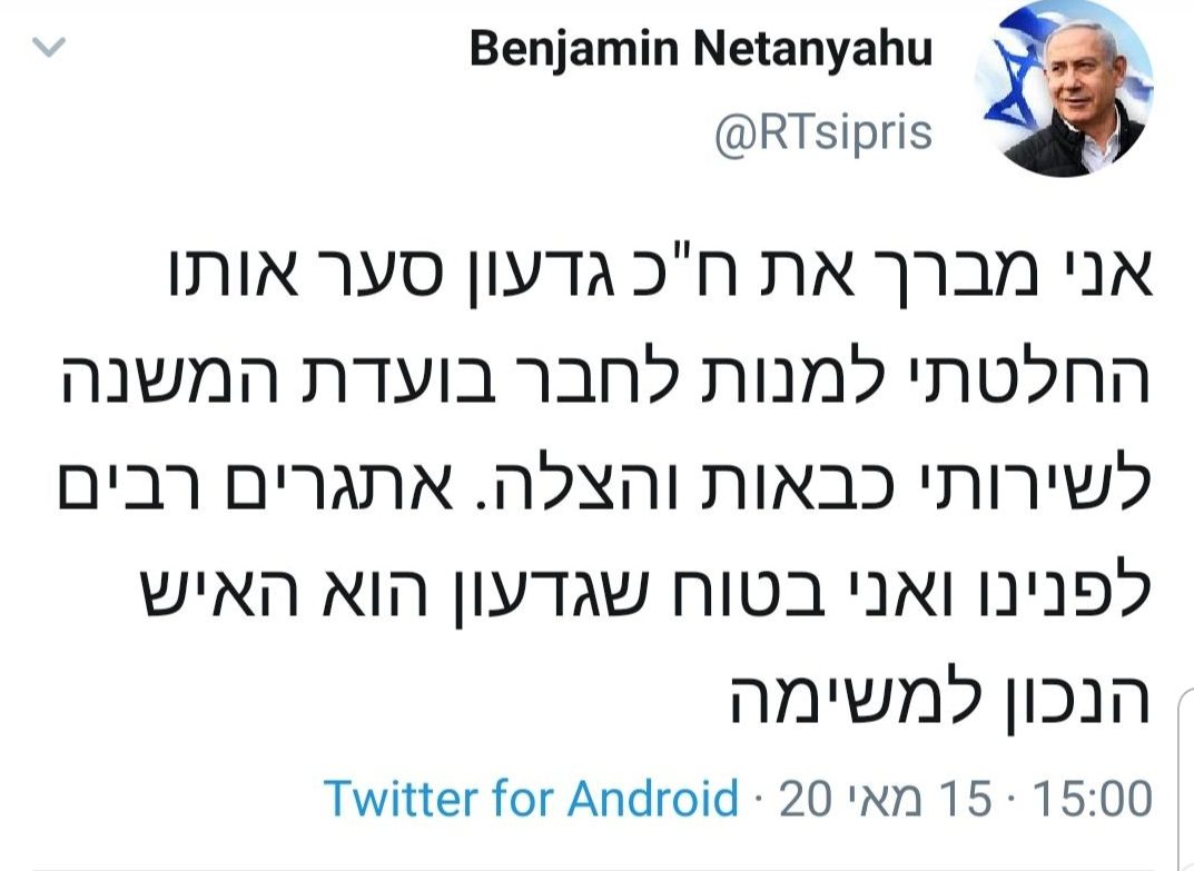 צ'יפרס החליף את תמונות הפרופיל ואת שמו לבנימין נתניהו, וכתב: "אני מברך את ח"כ גדעון סער אותו החלטתי למנות לחבר בועדת המשנה לשירותי כבאות והצלה. אתגרים רבים לפנינו ואני בטוח שגדעון הוא האיש הנכון למשימה"