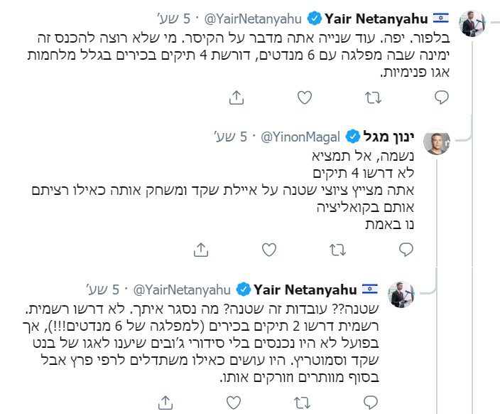 יאיר נתניהו נעלב והגיב: "בלפור. יפה. עוד שנייה אתה מדבר על הקיסר. מי שלא רוצה להכנס זה ימינה שבה מפלגה עם 6 מנדטים, דורשת 4 תיקים בכירים בגלל מלחמות אגו פנימיות."