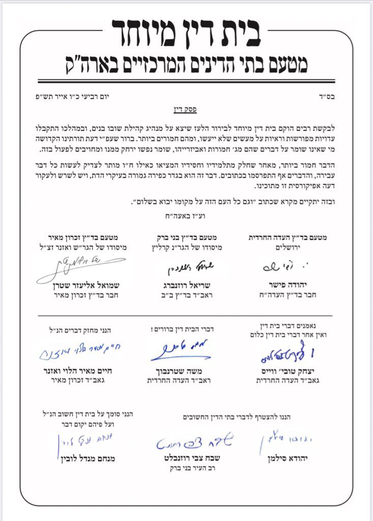 דרמה פנים חרדית: מספר שנים לאחר שנטען נגדו על מעשים אסורים שעשה בנשים, שלשה בתי דין מובילים במגזר החרדי חתמו על פסק הלכה דרמטי נגד מנהיג קהילת 'שובו בנים' אליעזר ברלנד.