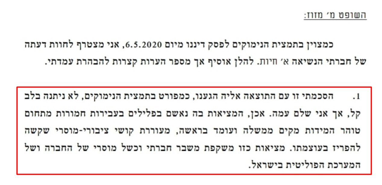 בתגובה לנימוקים כתב השופט מזוז בביקורת: "הרכבת ממשלה על ידי נאשם היא כשל מוסרי וליקוי מאורות של החברה הישראלית"