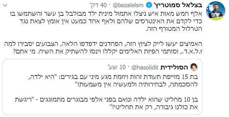 רק בת 9: שר התחבורה לשעבר בצלאל סמוטריץ' תוקף את משתתפי מצעד הגאווה בירושלים, בעקבות נאום אורח הכבוד טרנסגנדר בן 10: "אלף חמש מאות איש ניצלו אתמול מינית ילד מבולבל בן עשר והשתמשו בו כדי לקדם את האינטרסים שלהם ולאף אחד כמעט אין אומץ לצאת נגד הטרלול המטורף הזה. האמיצים יעשו לייק לציוץ הזה, הפחדנים ידפדפו הלאה, הצבועים יסבירו למה ז.ל.א.ד., וסותמי הפיות האלימים יקללו וינסו להשתיק את השיח. מי אתם?"